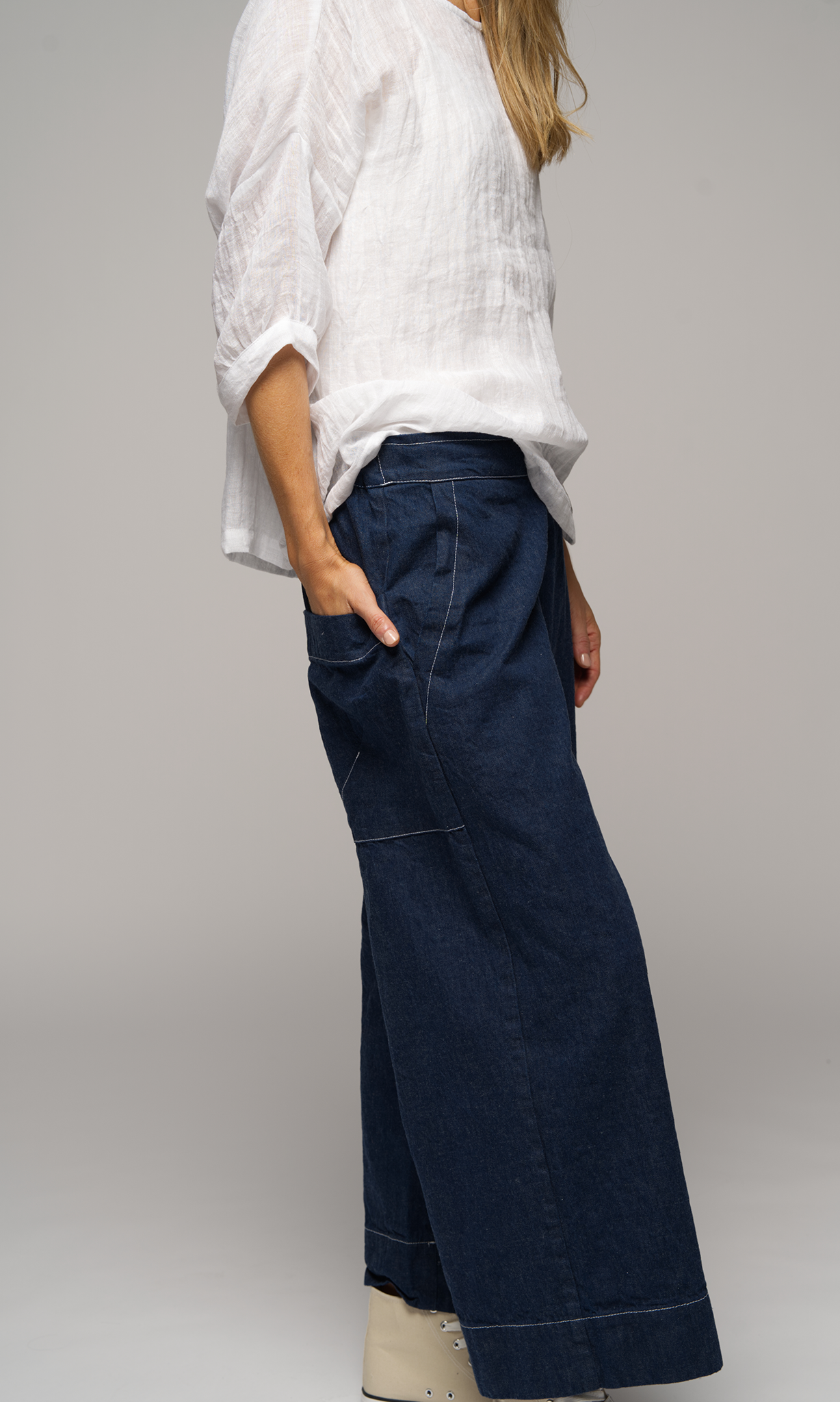 A mid-weight denim creates a new look to this classic Muse pant shape with detailed contrast topstitching. Featuring a flat front, elastic back waist and deep pockets both side and back.