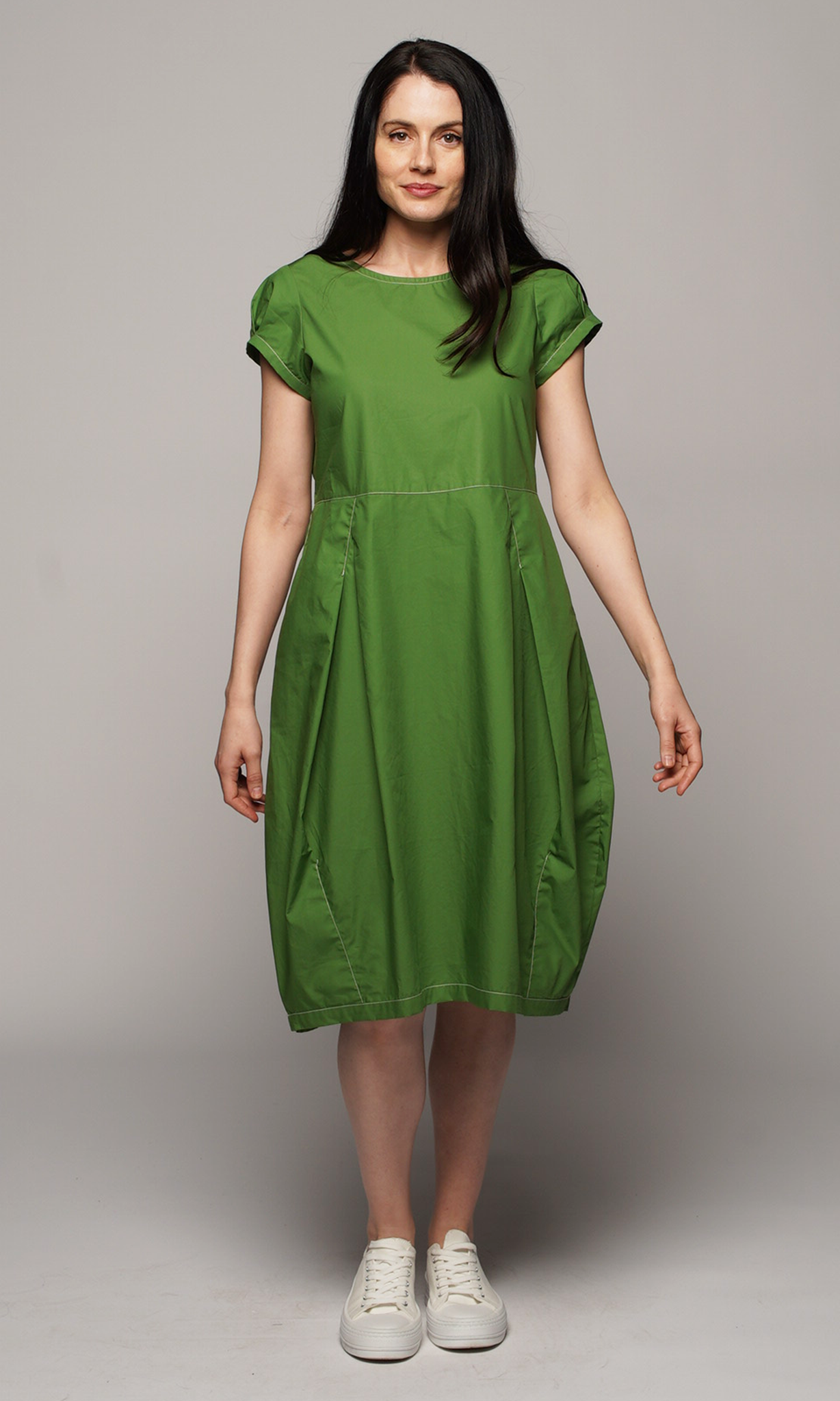A returned shape but with a twist, the Sienna Dress, with its added sleeve and tulip skirt, is crafted in crisp cotton poplin. Contrasting topstitching and structured pleats make it a summer staple, while generous pockets enhance its appeal.