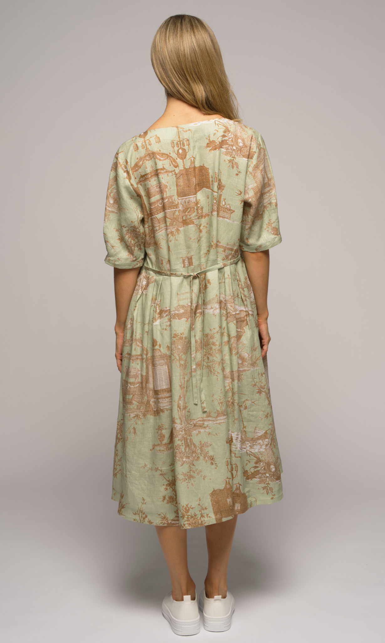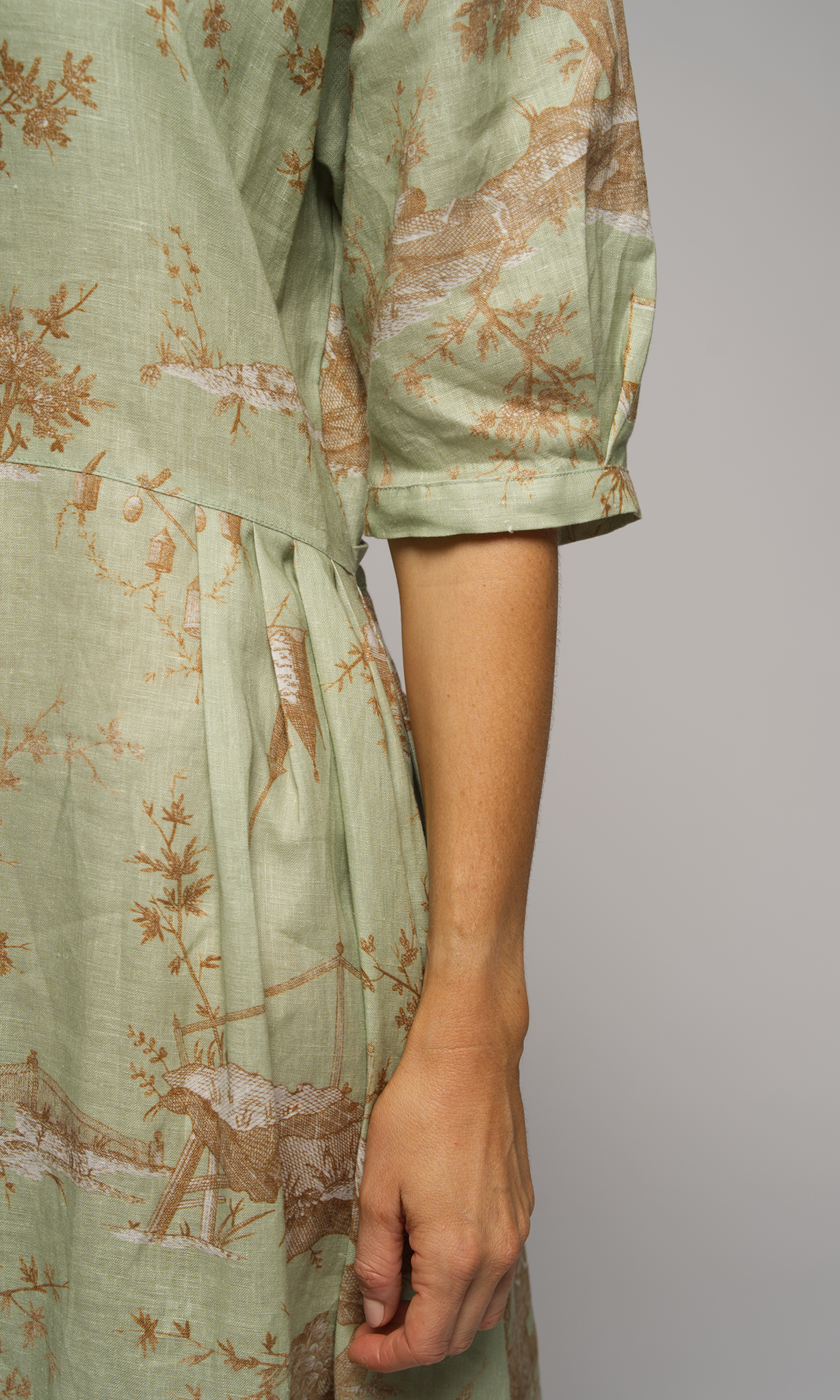 Fashioned from the delicate linen print, it features a slightly lengthened sleeve adorned with a tailored tuck and a flattering open V-neckline. Its flared skirt ensures a graceful flow, adding to its charm.