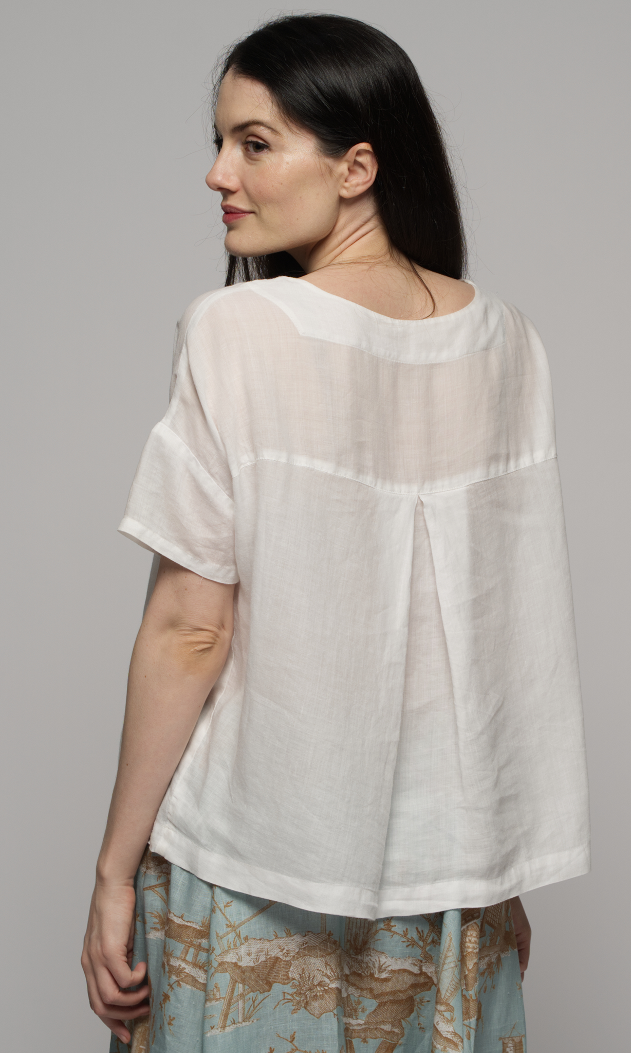 A new shape for Muse, the Versace Top features a clean flat front with a deep back pleat and a subtly extended hem at the back. Finished with small sleeves for light, flattering coverage.